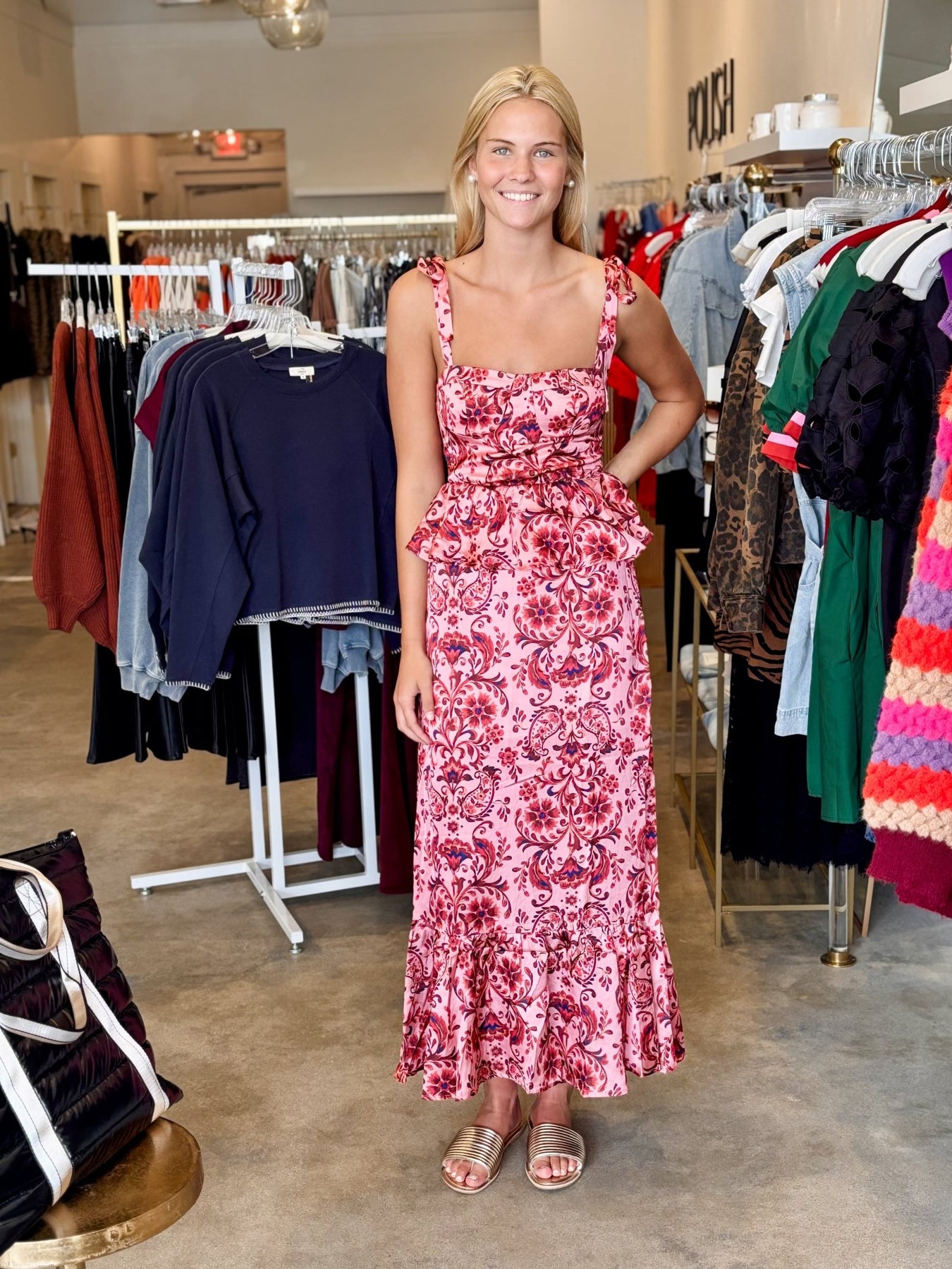 This playful Avalie Dress features a flattering corset top with adjustable tie straps for a custom fit. The maxi length flows beautifully with a peplum ruffle detail, adding a touch of flirty movement. Its salmon red paisley floral print brings vibrant, cheerful charm perfect for sunny days and lively evenings.