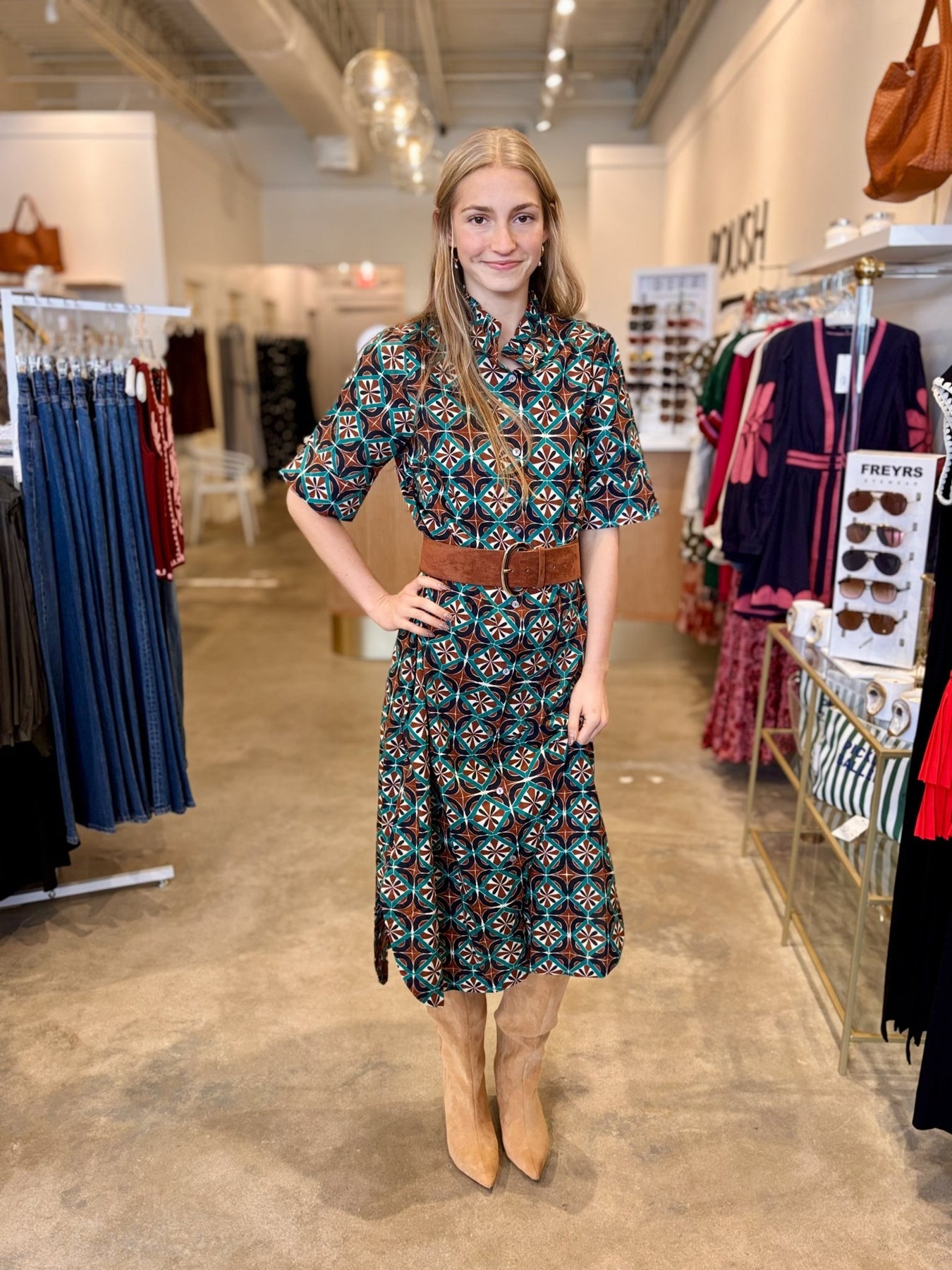 The Ivy Dress brings fun to your wardrobe with its lively geometric print and breezy short sleeves. This midi-length woven dress features a playful button-front closure and handy side pockets for your essentials. Fully lined and non-sheer, it keeps you feeling light and comfortable all day long. Perfect for adding a touch of charm to any outing!