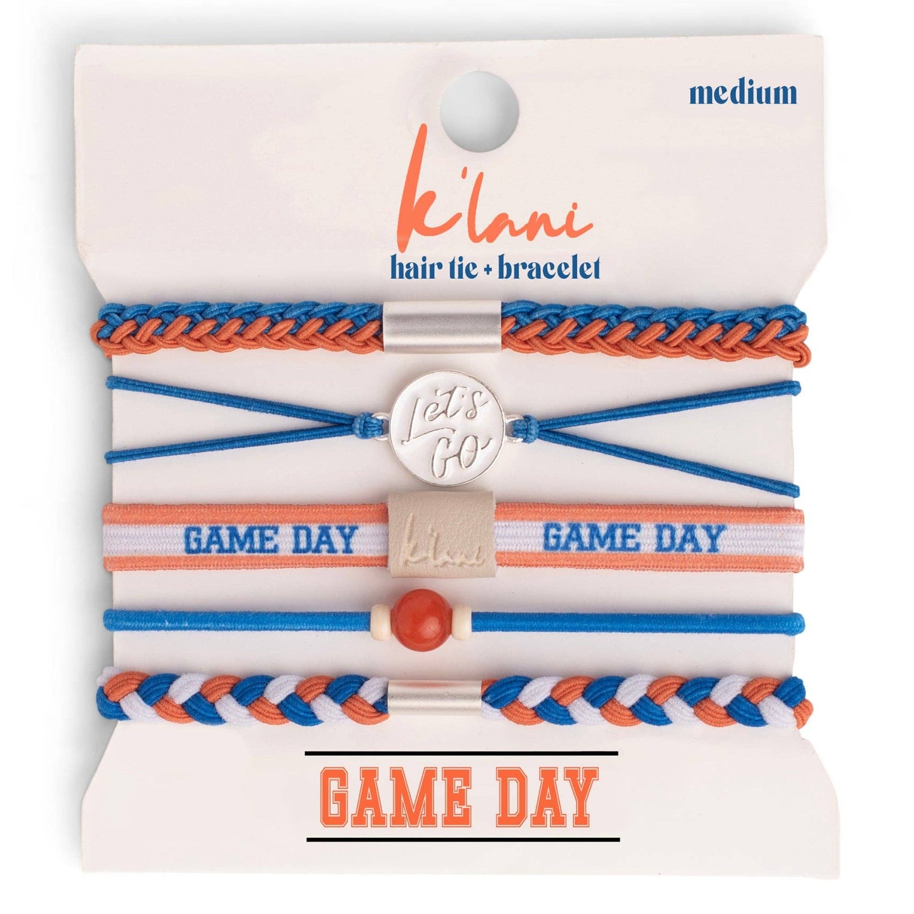 This Game Day set is made to show your school spirit with style and pride. These 5 hair tie bracelets feature bold team colors of blue and orange. They are perfect for cheering from the sidelines or celebrating a win. With a “Let’s Go” charm and a natural stone bead accent, this set is a fun way to support your team and wear your pride on your wrist while ready to pull your hair up when the games gets intense. Medium is the size of a normal hair tie band. It fits wrists between 5-6.4" around.