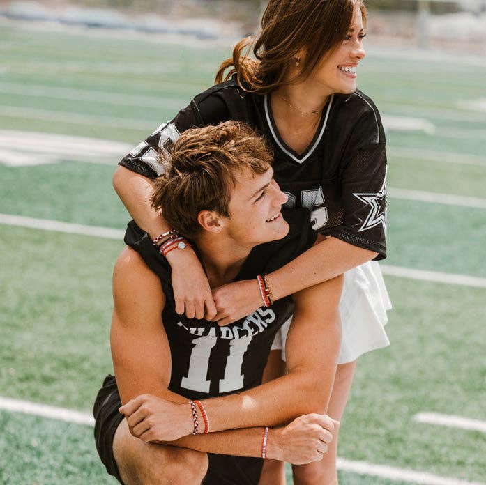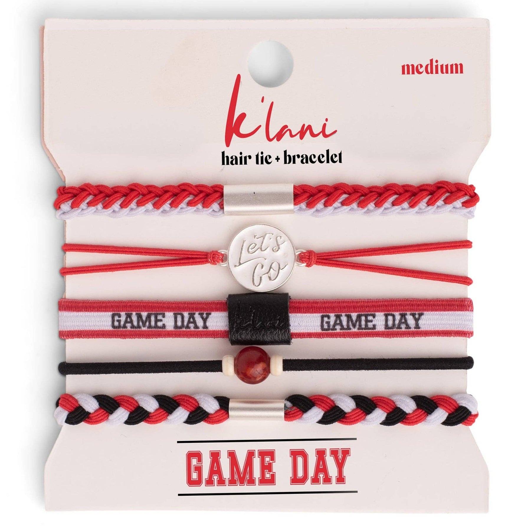 This Game Day set is made to show your school spirit with style and pride. These 5 hair tie bracelets feature bold team colors of red and white and are perfect for cheering from the sidelines or celebrating a win. With a “Let’s Go” charm and a natural stone bead accent, this set is a fun way to support your team and wear your pride on your wrist while ready to pull your hair up when the games gets intense. Medium is the size of a normal hair tie band. It fits wrists between 5-6.4" around.