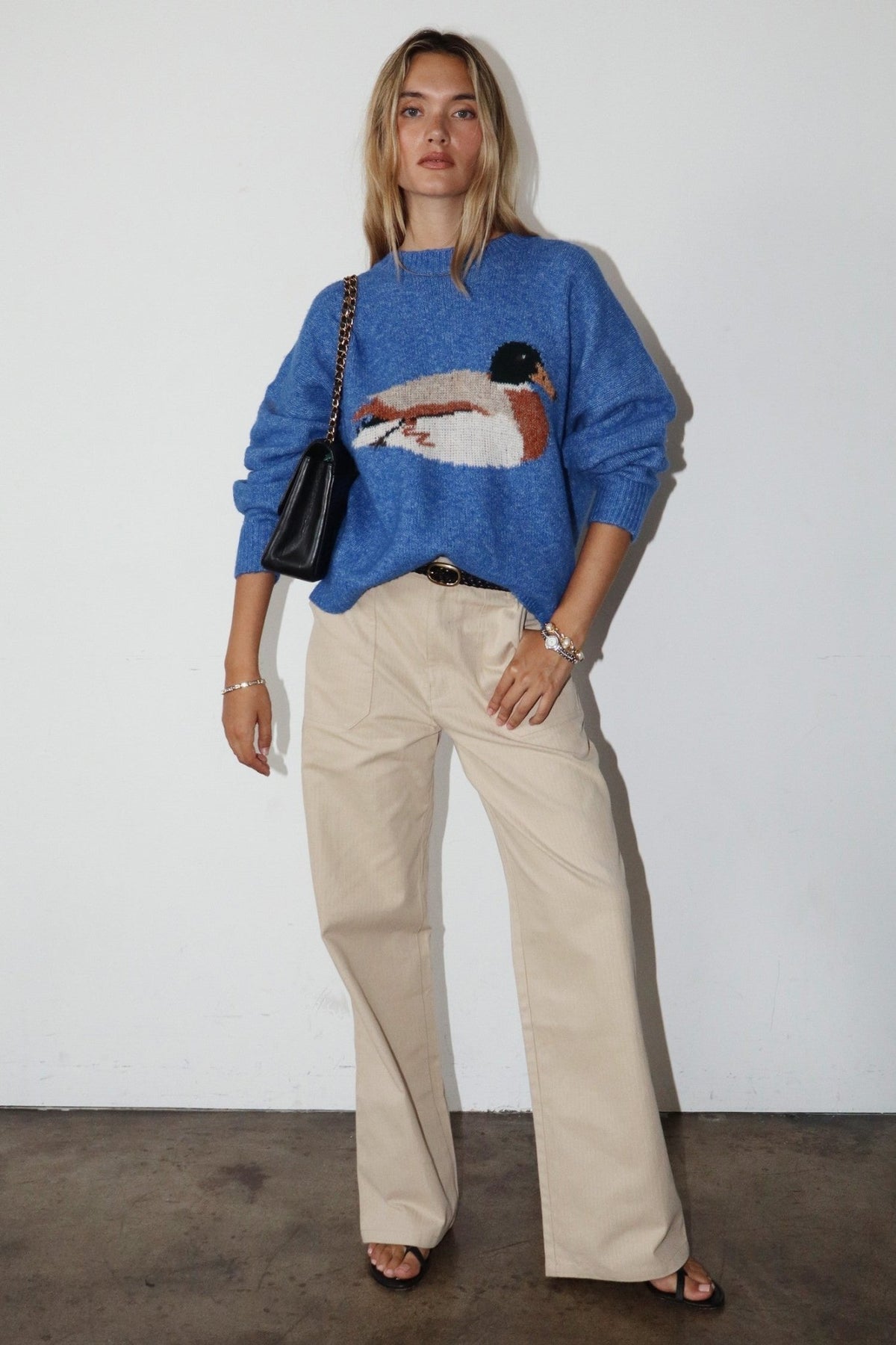 Elevate your everyday wardrobe with the Daisy Sweater, a refined knit piece in rich royal blue. Featuring a charming duck motif, this sweater blends playful design with timeless sophistication. Crafted from quality knit fabric, it offers comfortable wear for casual outings or layered styling. Perfect for those who appreciate understated elegance with a touch of whimsy.