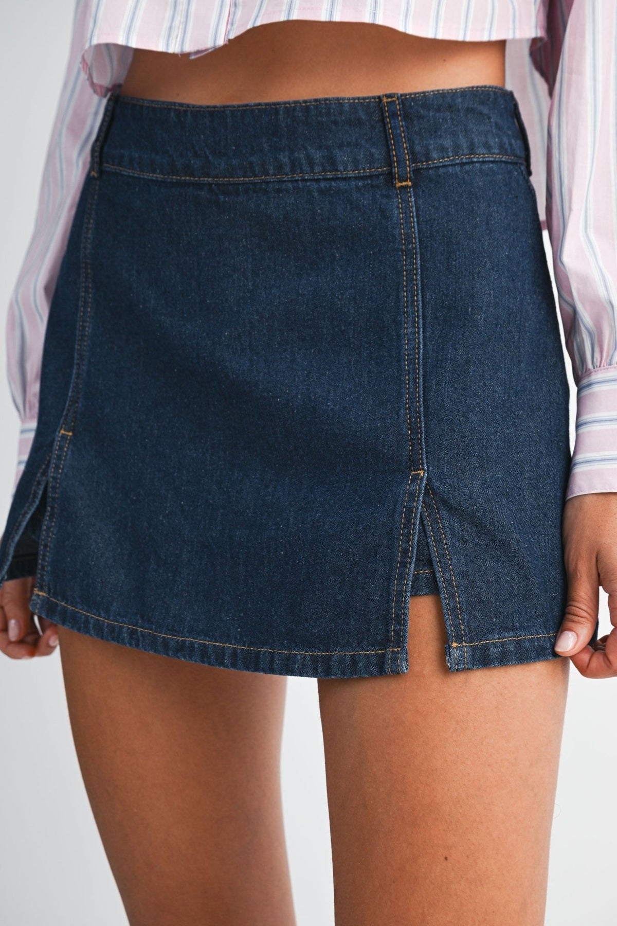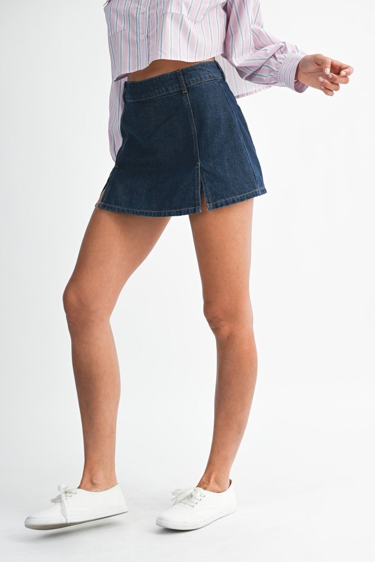 Sleek dark-wash denim skort designed for effortless style. The front slit detail adds movement and modern edge, while the skort silhouette offers the comfort of shorts with the polished look of a skirt. Perfect for casual outings, weekend errands, or layered styling. Crafted from classic denim that pairs seamlessly with sneakers, boots, or sandals.