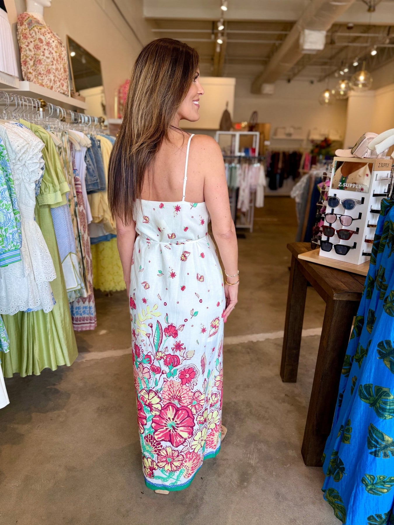 Effortless elegance meets vibrant color in this sleeveless midi dress. A striking floral border print in green and coral frames the button front, creating a resort-ready silhouette perfect for warm-weather occasions. The relaxed fit and midi length offer timeless versatility—dress it up for events or down for everyday wear. A modern take on classic prints that transitions seamlessly from day to evening.