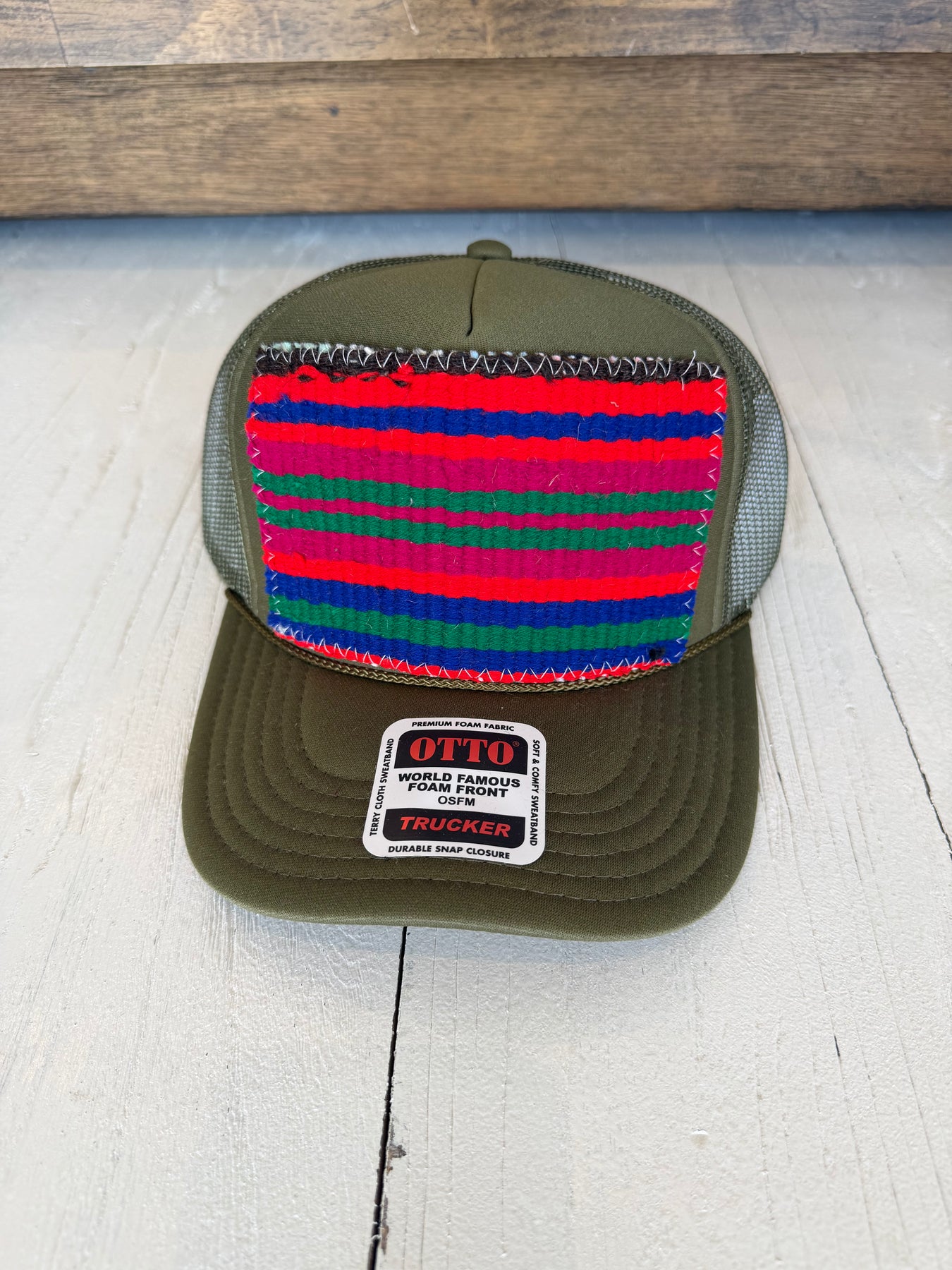 Your easy, throw-on-and-go, trucker hat with Turkish kilim patch. No two are alike! Truckers are one size hat with high crown, structured bill and mesh back with adjustable snaps.