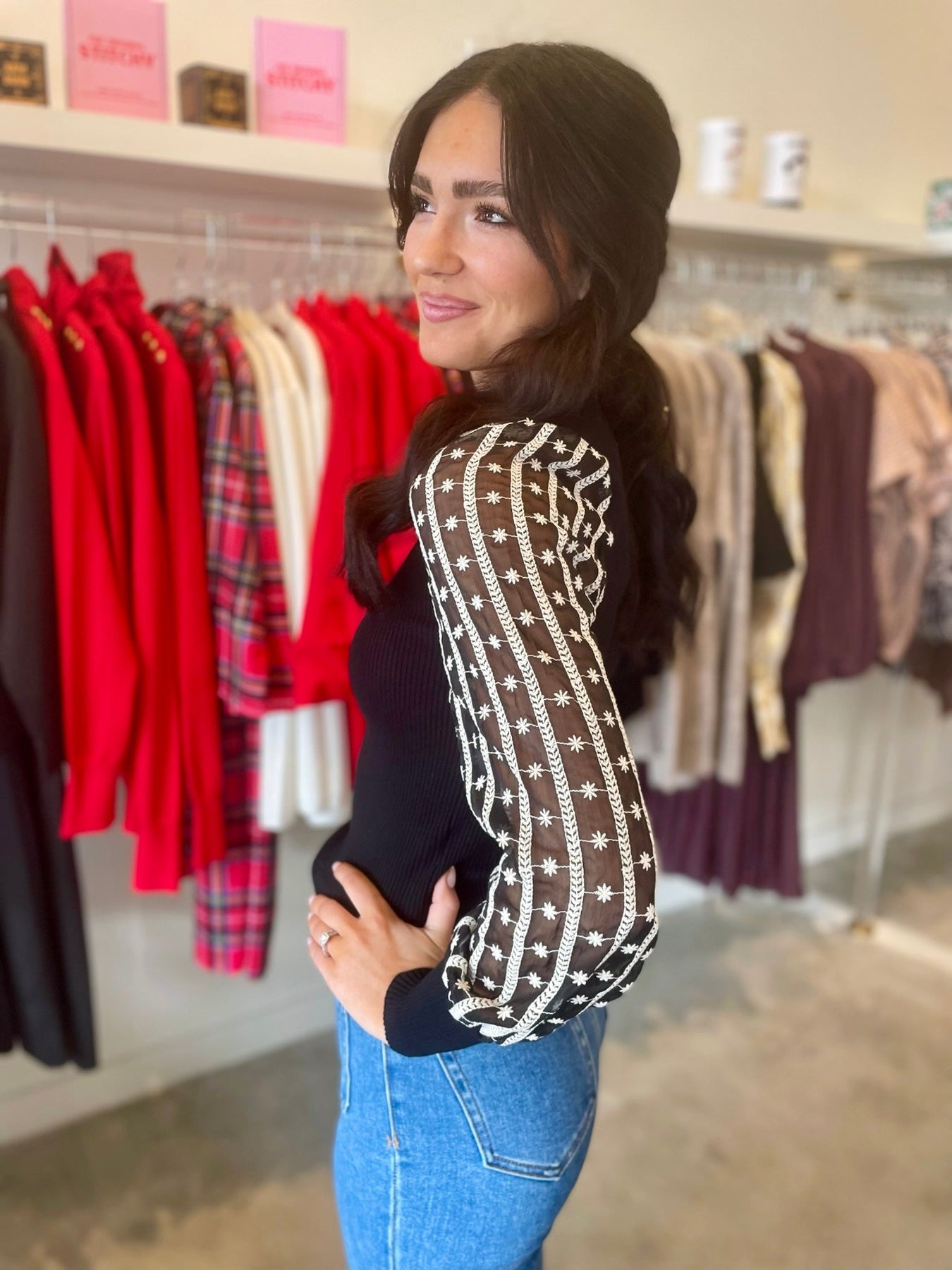 The Damia Top is a slim fit top with a mock neck. It features contrast, embroidered chiffon sleeves.