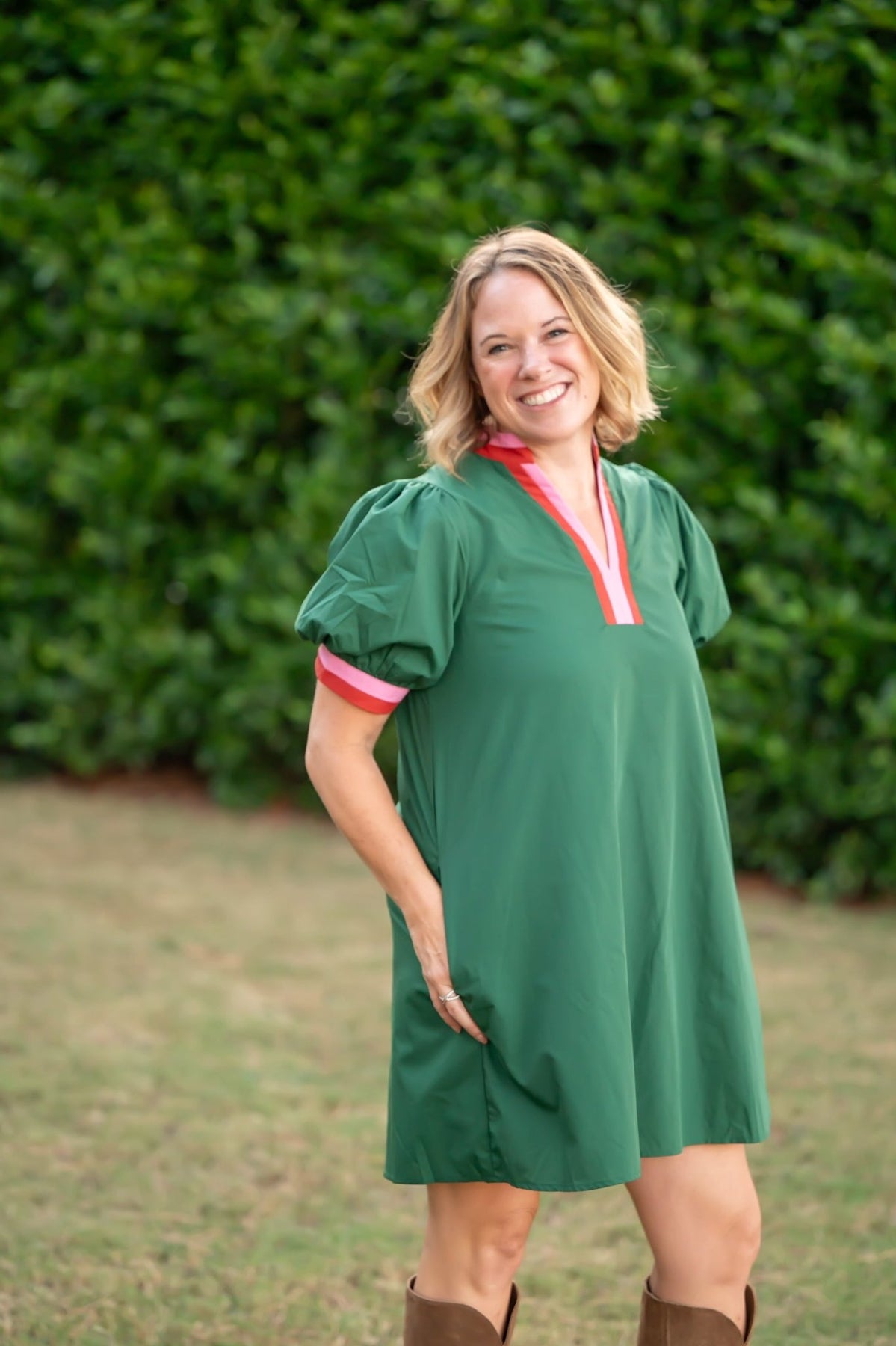 The Sloan Dress is a fun, lightweight pullover mini dress that brings a pop of color with its multicolor band accent in pink against hunter green. Its woven, non-sheer fabric keeps things breezy yet lined for comfort, while handy side pockets add a playful touch of practicality. Perfect for effortless style with a splash of charm!