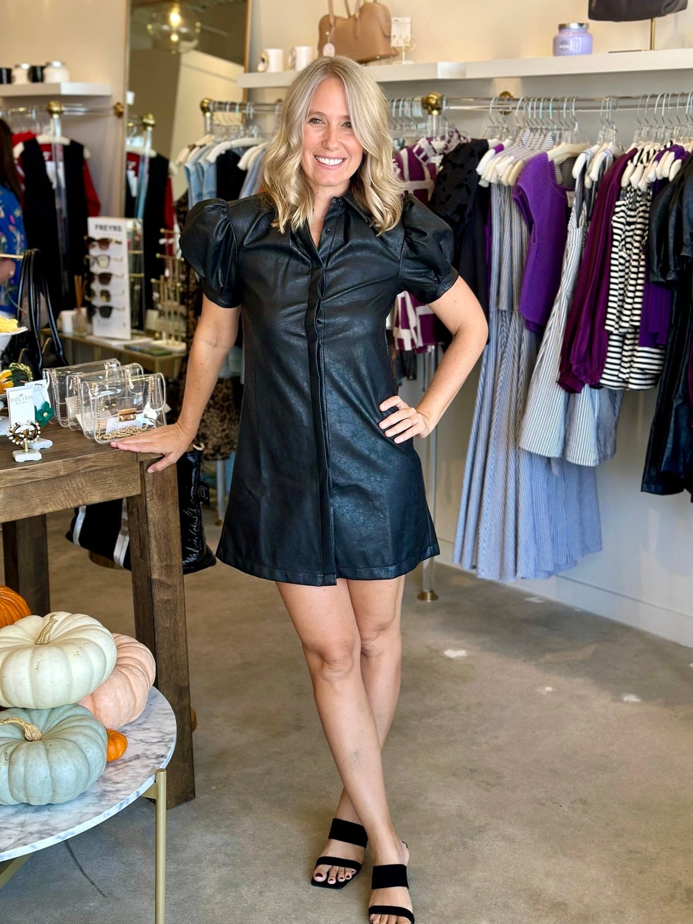 Unleash your inner fashionista with the Vivienne Mini Dress! This playful collared dress features soft puff sleeves and is made with cruelty-free vegan leather. You'll look and feel fabulous, while also supporting sustainable fashion. Don't miss out on this unique and stylish addition to your wardrobe.