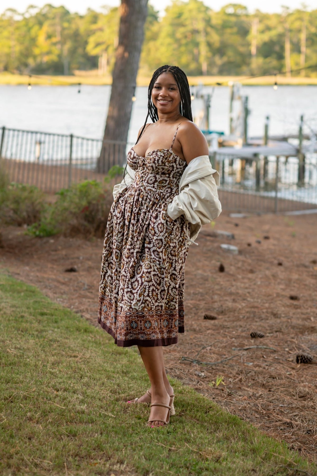 Step into charm with the Lana Dress, featuring a playful brown floral pattern that adds a touch of whimsy to your wardrobe. Its midi length offers a flattering silhouette, while the corset top enhances your shape with a fun, flirty vibe. Adjustable spaghetti straps let you customize the fit for all-day comfort and effortless style. Perfect for twirling through any occasion with confidence and ease.