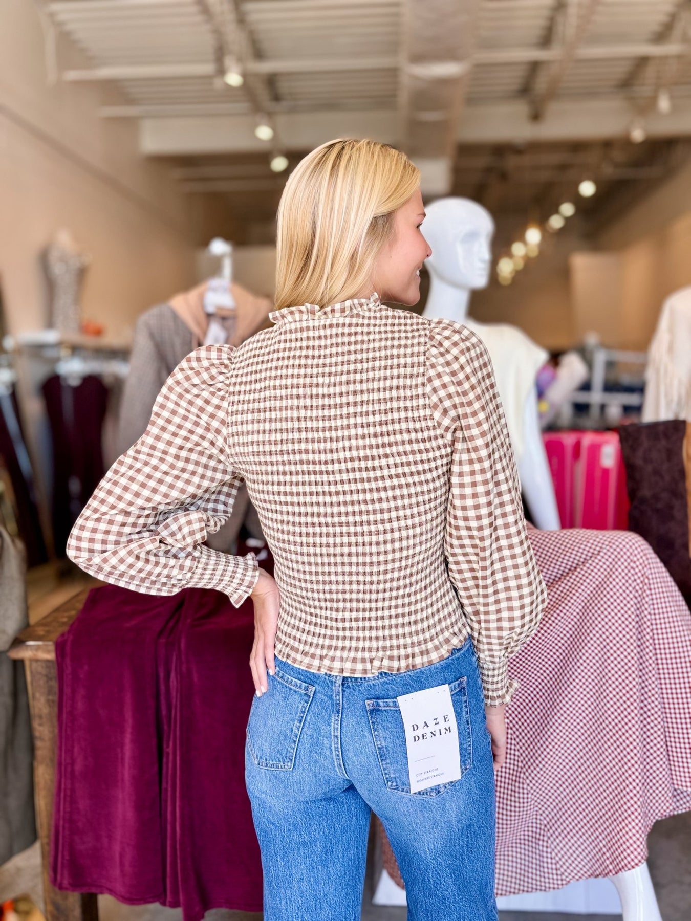 Add a touch of charm with the Paige Top—a gingham delight featuring long puff sleeves and a smocked bodice that hugs just right. The playful ruffle hem and front zip closure make it easy to wear, while the lightweight, non-sheer woven fabric keeps you comfy all day. Available in rich Hunter and warm Mocha, this top is perfect for mixing fun and style effortlessly.